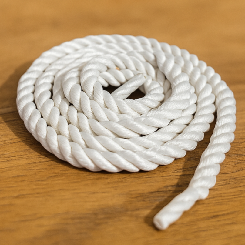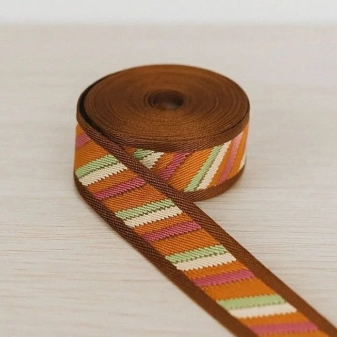 Fita de cabelo ou cordão de cor rosa, enrolado em forma de espiral sobre fundo bege.